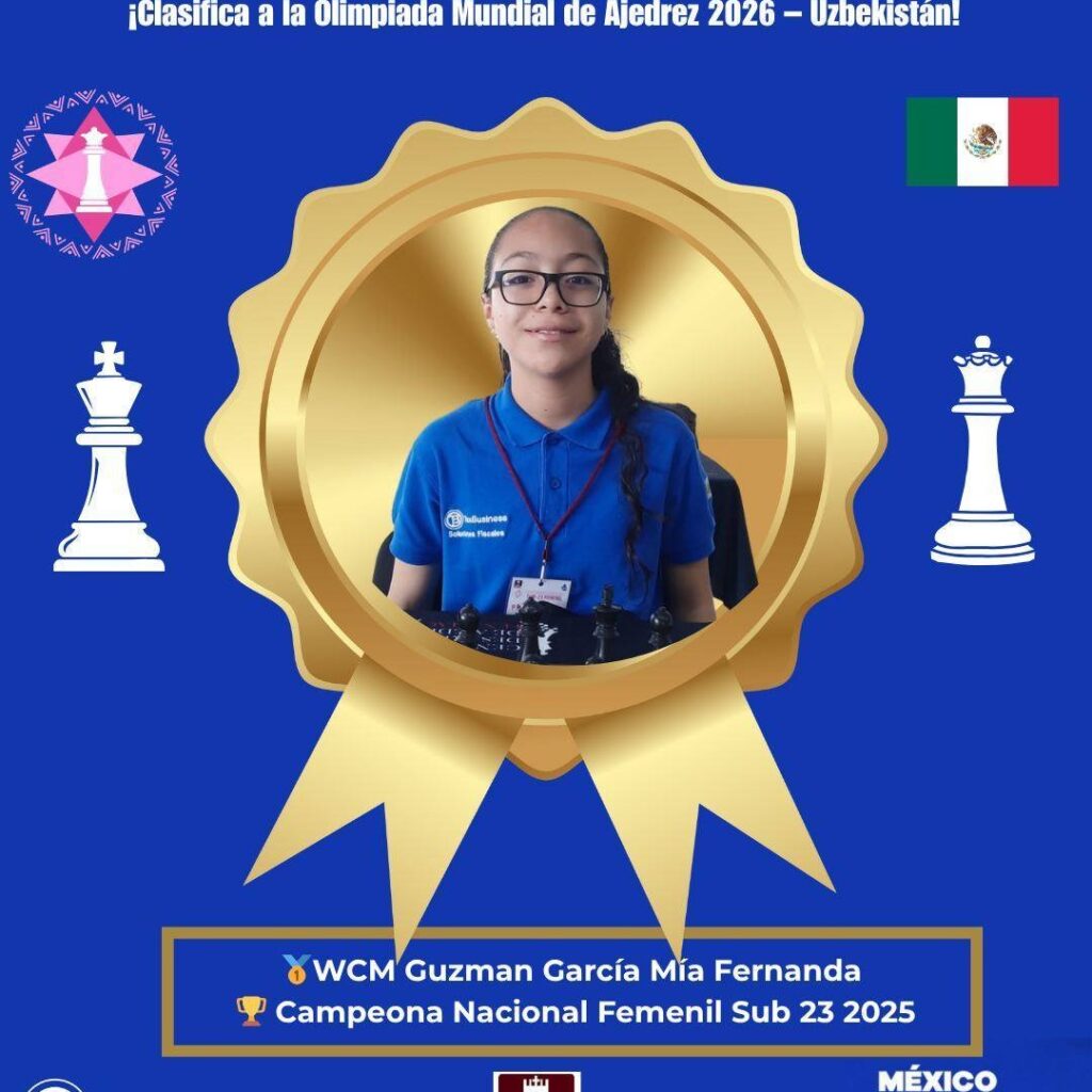 Lunes 13 de Octubre del 2025.- La talentosa ajedrecista juarense Mía Fernanda Guzmán García, de tan solo 12 años de edad, se consagró Campeona Nacional Sub -23 Femenil 2025, marcando un logro sin precedentes en el ajedrez mexicano por la edad a la que lo consigue y el nivel competitivo que se tuvo en el torneo. El campeonato se llevó…