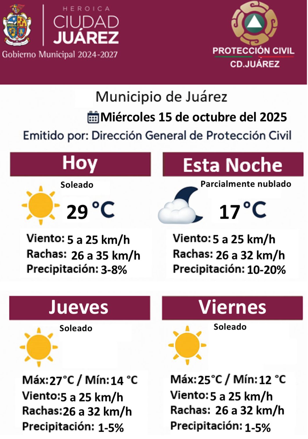 Miércoles 15 de Octubre del 2025.- La Dirección General de Protección Civil informó que para este miércoles 15 de octubre de 2025 se espera un día mayormente soleado, con una temperatura máxima de 29 °C y condiciones estables en la mayor parte del municipio.