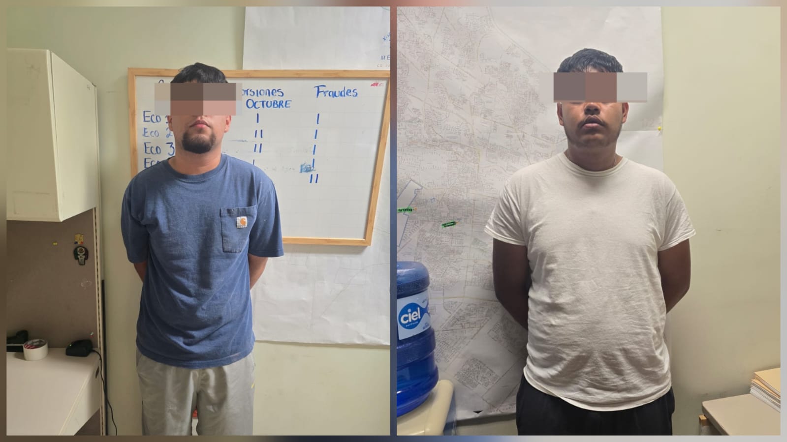 Ciudad Juárez, Chih., a 17 de octubre de 2025.- Elementos de la Agencia Estatal de Investigación adscritos a la Unidad de Investigación Especializada en Delitos de Extorsión, de la Fiscalía de Distrito Zona Norte, detuvieron a los masculinos identificados como Gerardo G. A., y Ángel Fernando S. G., por su presunta responsabilidad en el delito de extorsión, en Ciudad Juárez.
