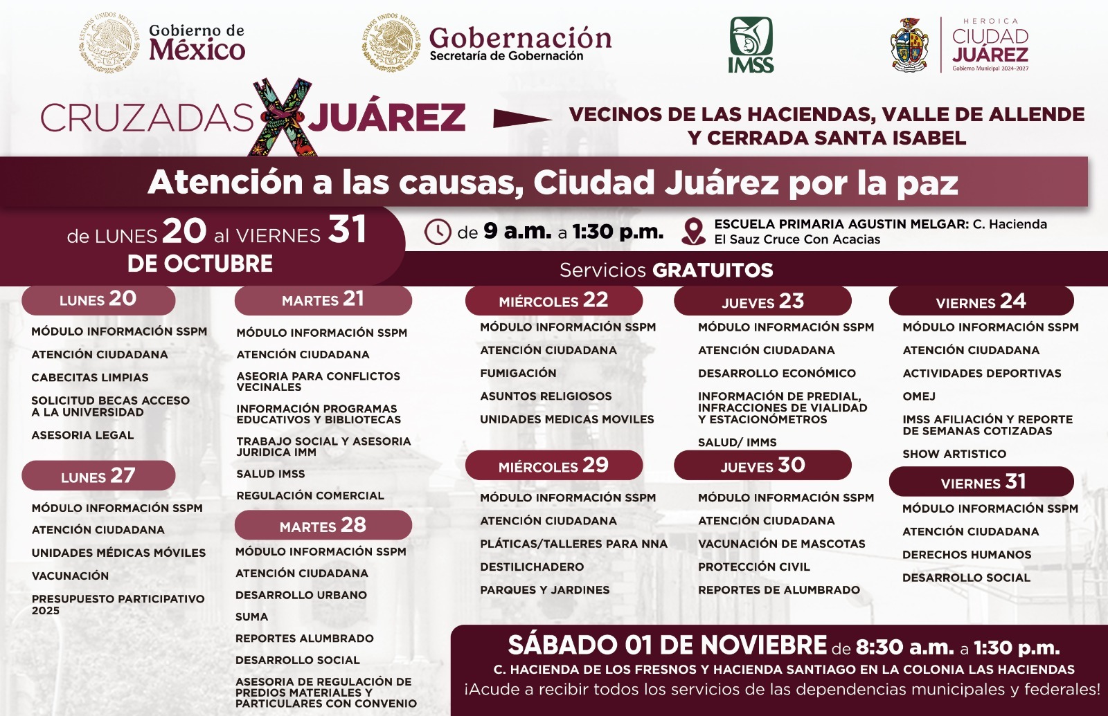 Miércoles 22 de Octubre del 2025.- El próximo sábado 1 de noviembre se llevará a cabo el programa Cruzadas por Juárez, Atención a las Causas, Ciudad Juárez por la Paz en la colonia Las Haciendas, en la calle Hacienda de los Fresnos y Hacienda Santiago de 8:30 de la mañana a 1:30 de la tarde.
