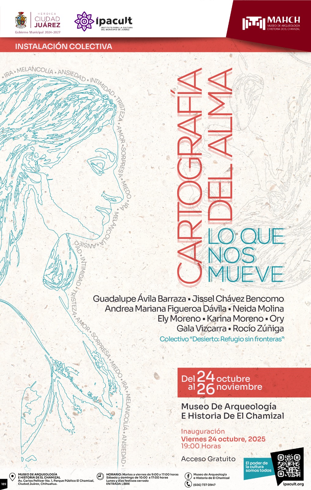 Jueves 23 de Octubre del 2025.- El arte se convierte en espejo de las emociones humanas con la exposición “Cartografía del Alma: Lo que nos mueve”, una propuesta del Colectivo Desierto Refugio Sin Fronteras que será inaugurada mañana viernes 24 a las 7:00 de la tarde en el Museo de Arqueología e Historia de El Chamizal (MAHCH), bajo la organización del Instituto para la Cultura del Municipio de Juárez (IPACULT).
