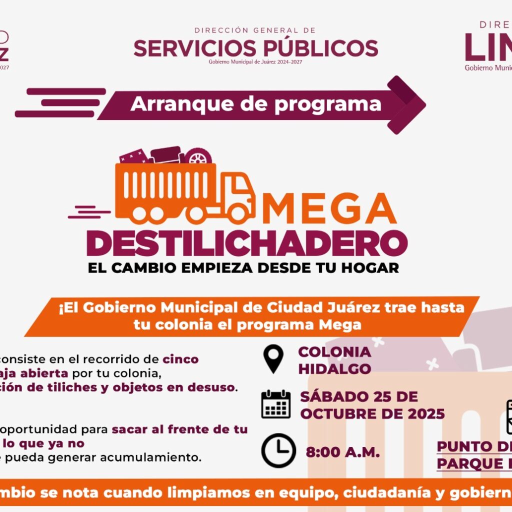 Viernes 24 de Octubre del 2025.- La Dirección de Limpia, dependiente de la Dirección General de Servicios Públicos, se encuentra lista para poner en marcha el nuevo programa mega destilichadero, encabezado por el Presidente Municipal, Cruz Pérez Cuéllar, que se llevará a cabo mañana sábado en las colonias Hidalgo y Américas. El director de Limpia, Gibran Solís, informó que este…