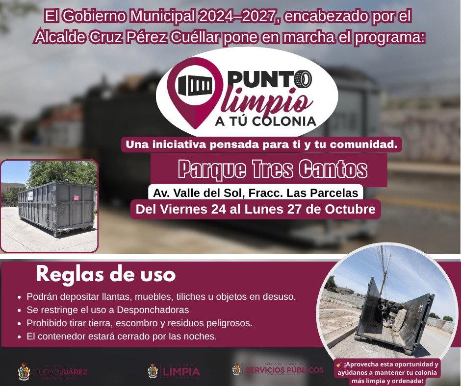 Viernes 24 de Octubre del 2025.- Desde este viernes 25 al lunes 27 de octubre, el programa “Punto Limpio a tu Colonia” estará disponible en tres ubicaciones de la ciudad para que los juarenses puedan disponer de manera responsable de residuos voluminosos. Los contenedores estarán instalados en el Parque Tres Cantos, sobre la calle Valle del Sol, en la lateral…