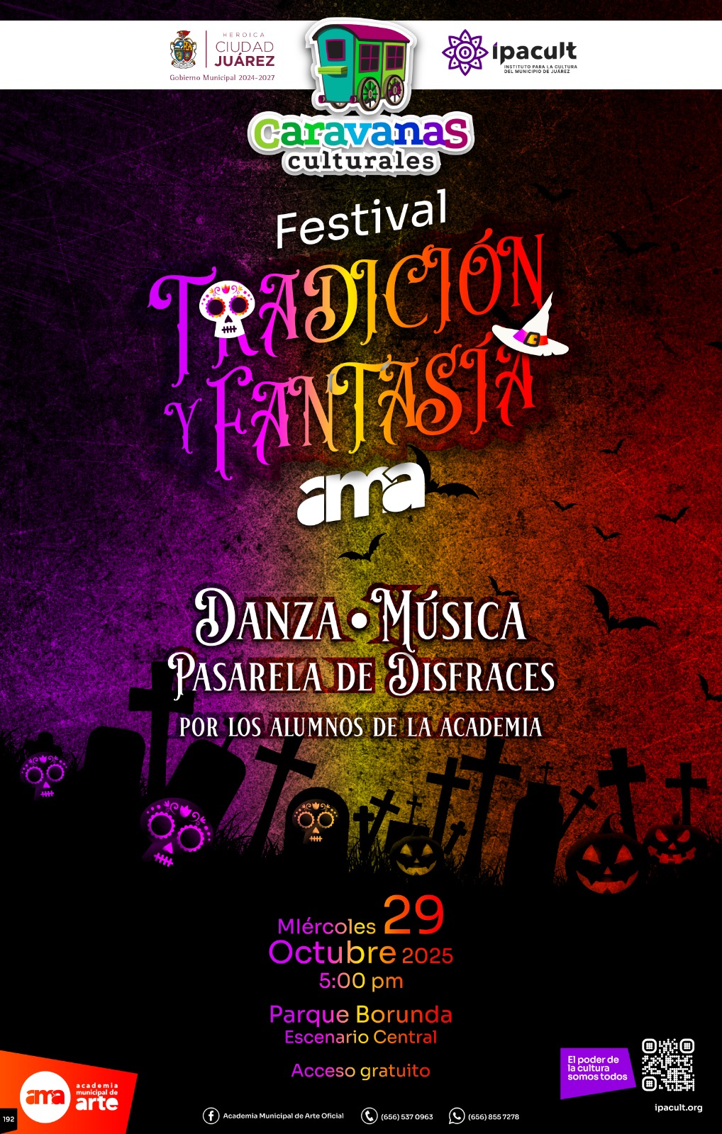 Martes 28 de Octubre del 2025.- Como parte del programa Caravanas Culturales, el Instituto para la Cultura del Municipio de Juárez (IPACULT) invita a la comunidad juarense al Festival de Tradición y Fantasía, organizado por la Academia Municipal de Arte (AMA), que se llevará a cabo este miércoles 29 de octubre a las 5:00 de la tarde en el Parque Borunda.