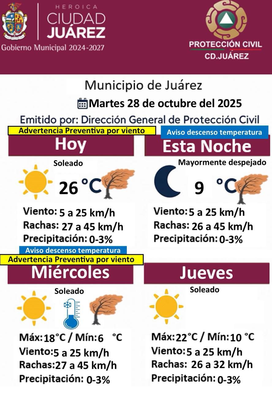 Martes 28 de Octubre del 2025.- La Dirección General de Protección Civil del Municipio emitió una advertencia preventiva por vientos y un aviso por descenso de temperatura para este martes 28 de octubre, con el objetivo de mantener informada a la población sobre las condiciones climatológicas de los próximos días.
