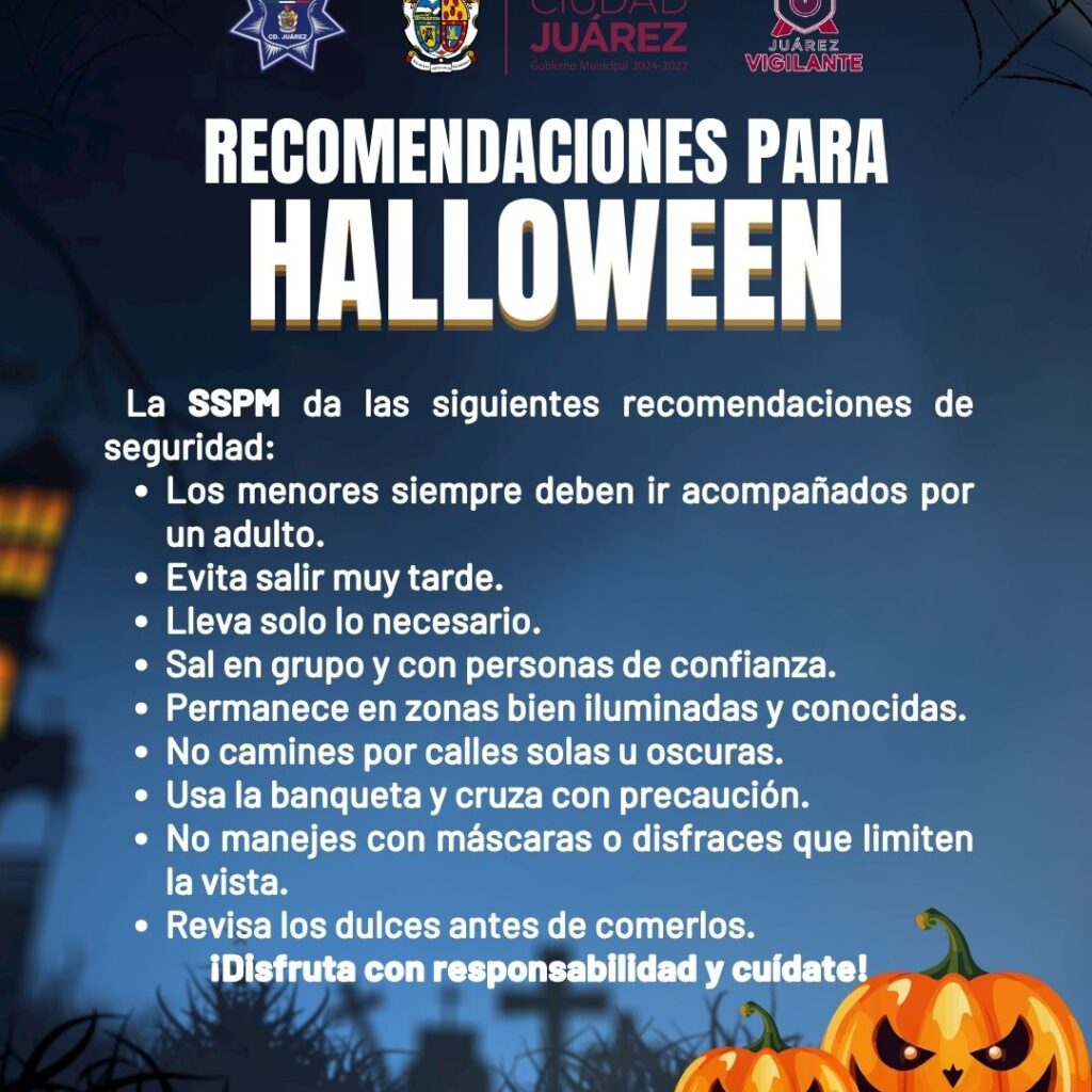 Miércoles 29 de Octubre del 2025.- La Secretaría de Seguridad Pública Municipal te invita a disfrutar de esta noche especial con responsabilidad. Antes de salir a pedir dulces, sigue estas recomendaciones para mantener nuestras calles seguras: ✅ Acompaña siempre a los menores durante su recorrido.🚫 Evita caminar por calles solas o con poca iluminación.📍 Informa a tus familiares dónde estarás…