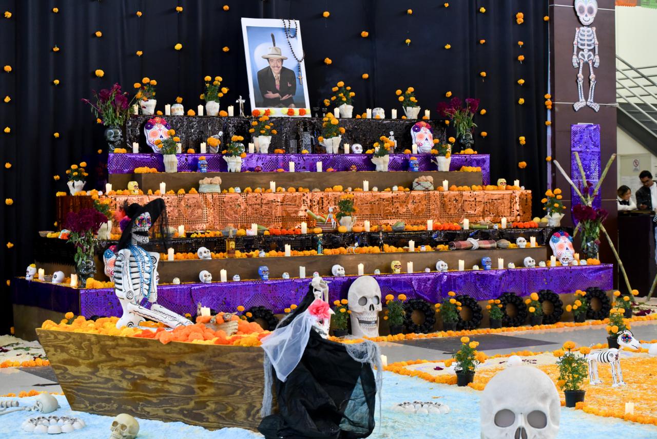 El altar luce flores de cempasúchil, aserrín de colores, pan de muerto, calaveras y platillos típicos mexicanos, entre ellos burritos, enchiladas y calabacitas, además de objetos alusivos a la vida y obra de “Tin Tan”, recordado como el “Pachuco de Oro” que llevó el nombre de Juárez al mundo entero. En el centro, una fotografía del actor resalta entre veladoras que simbolizan el camino de luz hacia el reencuentro espiritual.