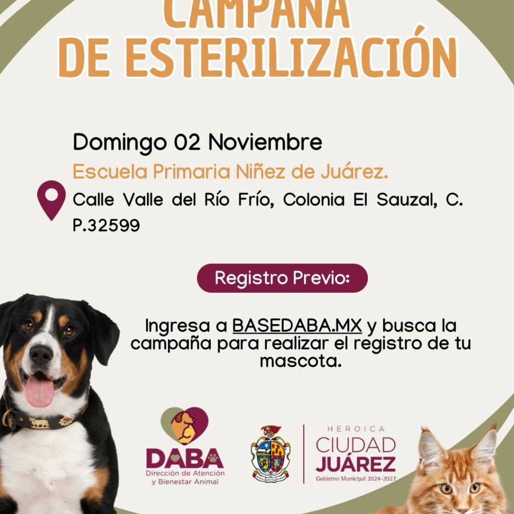 Viernes 31 de Octubre del 2025.- Además de hoy y mañana, la Dirección de Atención y Bienestar Animal (DABA), dará el servicio gratuito de esterilización de mascotas el próximo domingo. Alma Edith Arredondo Salinas, titular de la dependencia, indicó que al principio se tenían contempladas dos jornadas en distintos espacios, sin embargo, debido a la buena respuesta de los juarenses,…