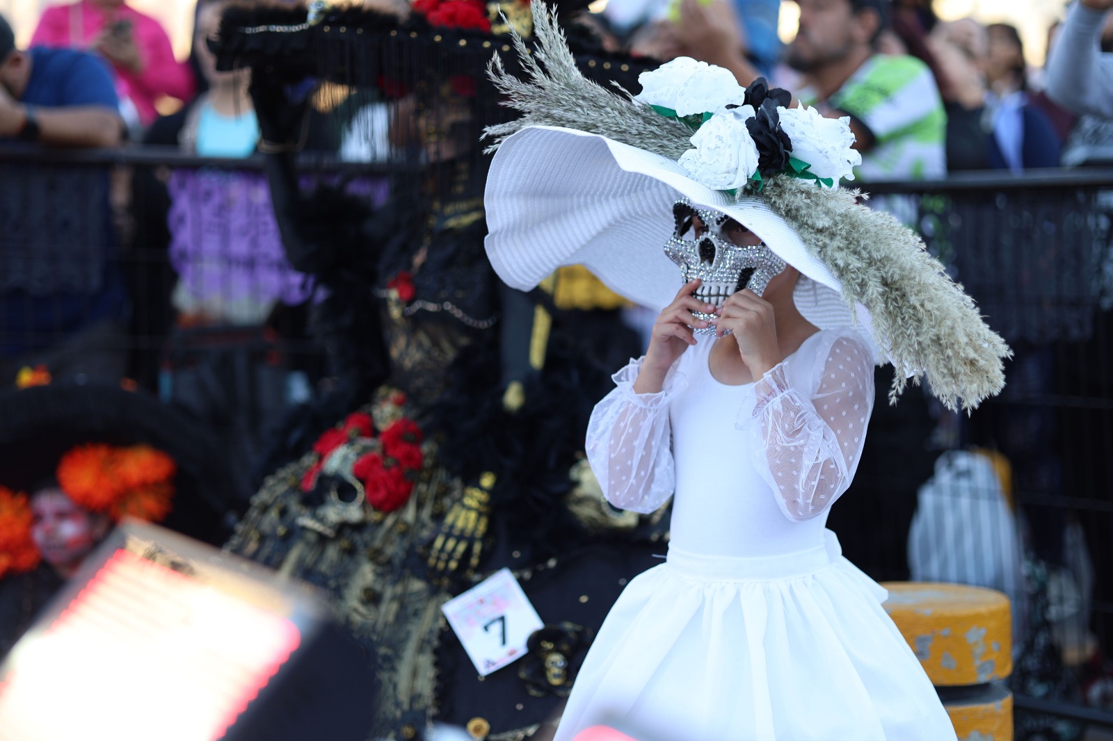 Entre el bullicio de las familias y el ritmo del zapateado, las catrinas desfilaron con elegancia y color, convertidas en verdaderas obras de arte que capturaron todas las miradas.