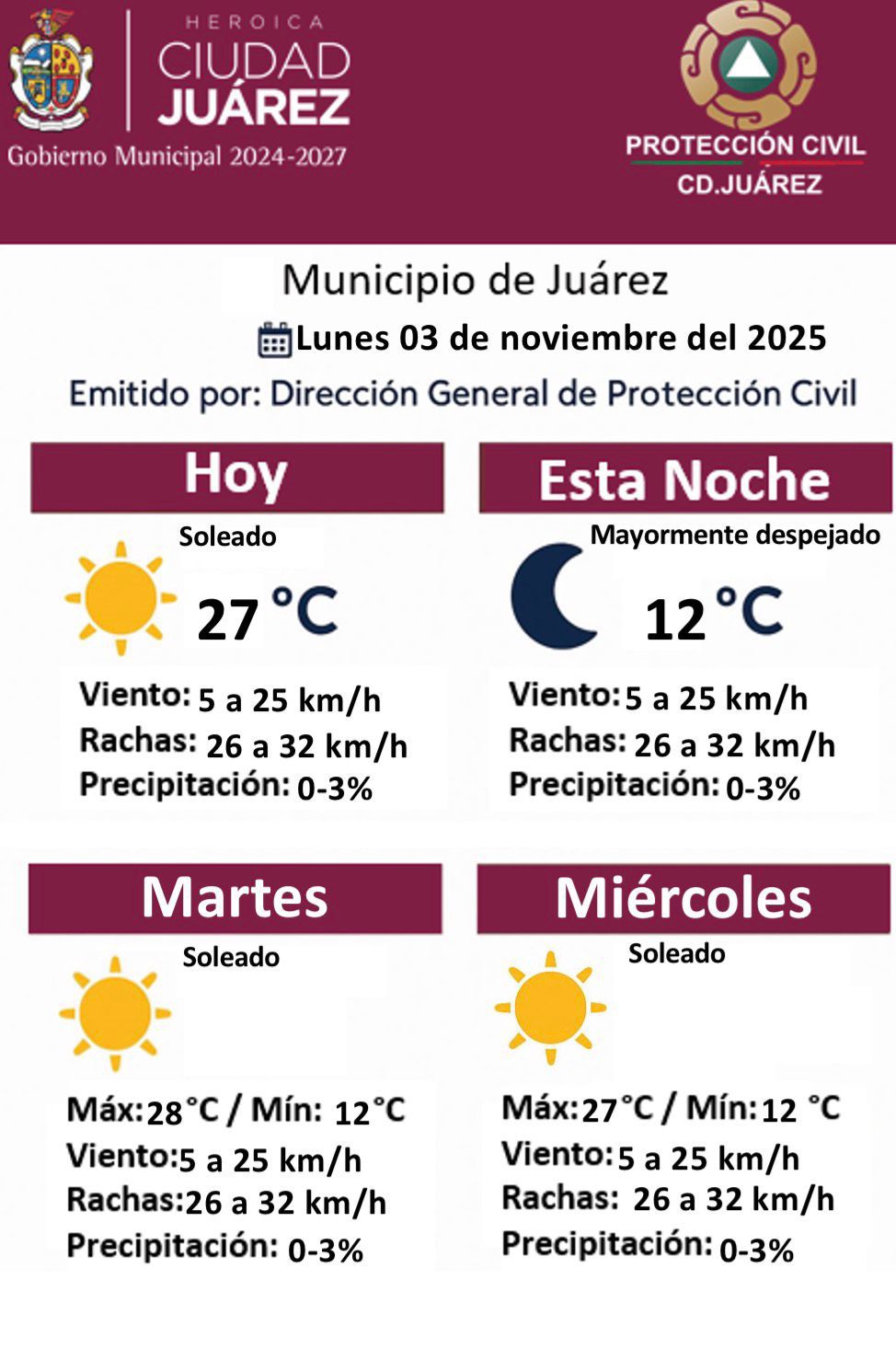 Lunes 3 de Noviembre del 2025.- La Dirección General de Protección Civil informó que este lunes 3 de noviembre se espera un día soleado en Ciudad Juárez, con una temperatura máxima de 27 grados centígrados y mínima de 12 grados durante la noche, la cual se mantendrá mayormente despejada.