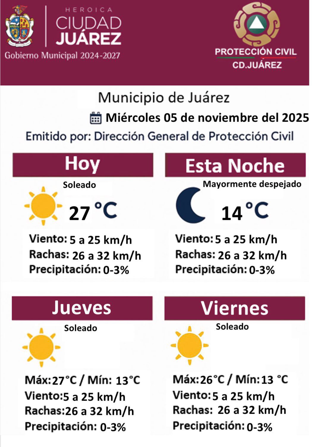 Miércoles 5 de Noviembre del 2025.- La Dirección General de Protección Civil informó que este miércoles 5 de noviembre se espera un día soleado en Ciudad Juárez, con una temperatura máxima de 27 °C y mínima de 14 °C durante la noche, condiciones mayormente despejadas y sin probabilidad significativa de lluvia.