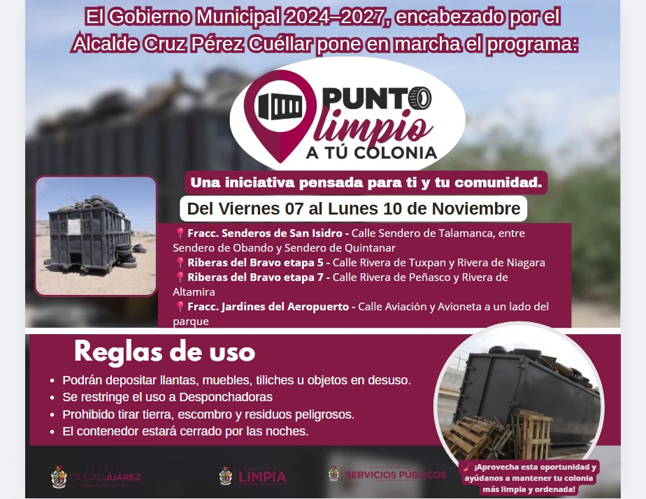 Viernes 7 de Noviembre del 2025.- El programa “Punto Limpio a tu Colonia” continúa operando de manera itinerante en distintos sectores de la ciudad, con el propósito de ofrecer a las y los juarenses un espacio adecuado para la disposición de residuos domésticos no peligrosos, dio a conocer el titular de la Dirección de Limpia, Gibran Solís Kanahan.