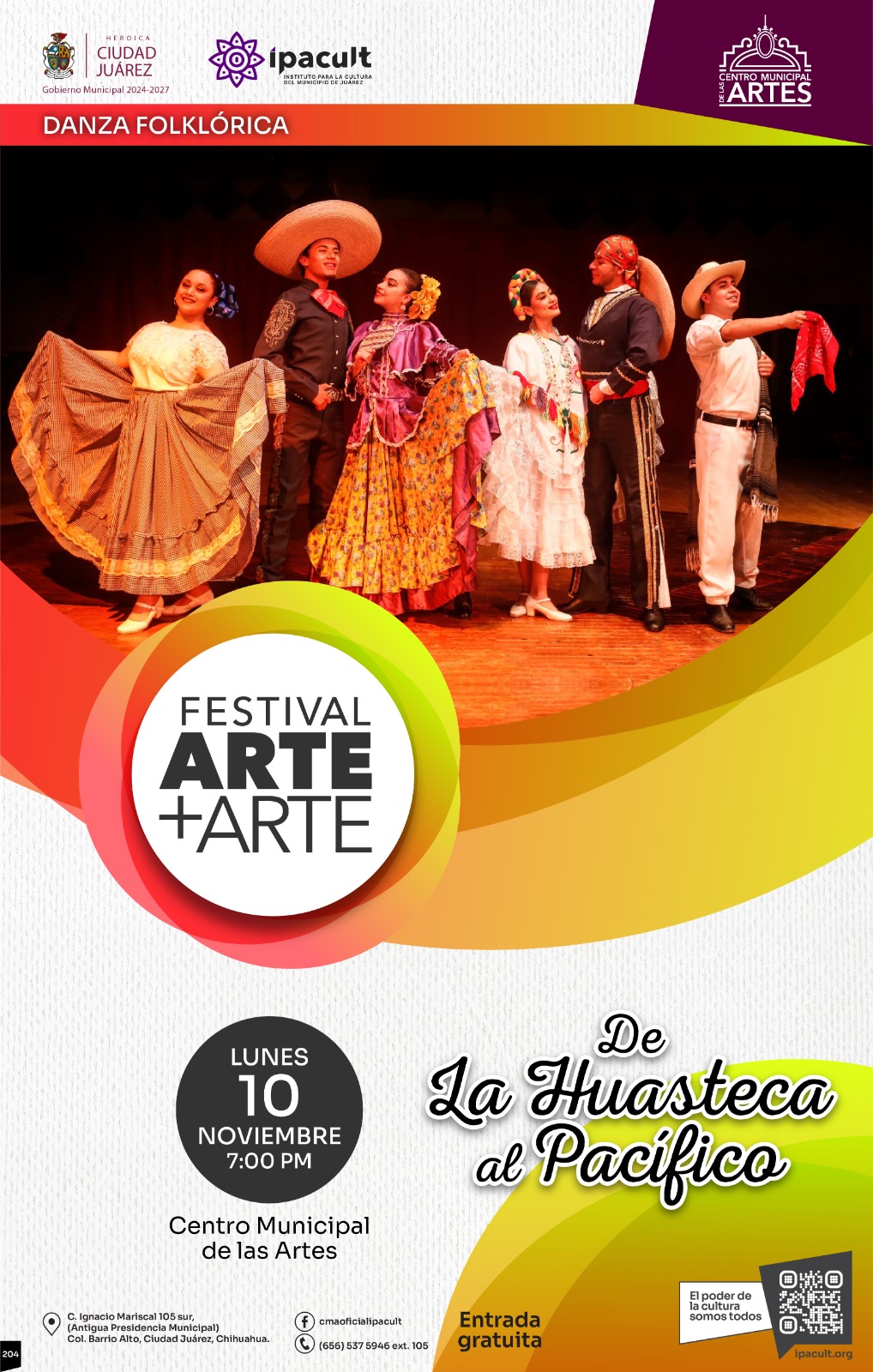 Lunes 10 de Noviembre del 2025.- El Instituto para la Cultura del Municipio de Juárez (IPACULT) invita a la comunidad juarense a disfrutar del Festival Arte+Arte, que arranca este lunes 10 de noviembre y se extenderá hasta el viernes 14, en las instalaciones del Centro Municipal de las Artes (CMA), ubicado en la antigua Presidencia Municipal, detrás de la Catedral de Nuestra Señora de Guadalupe, en el Centro Histórico.