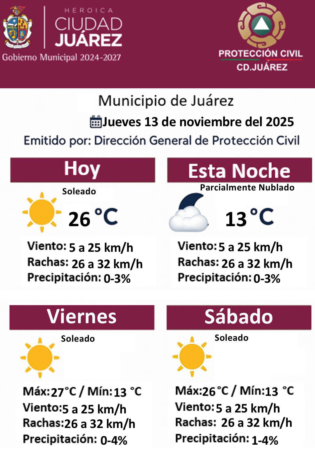 Jueves 13 de Noviembre del 2025.- La Dirección General de Protección Civil del Municipio informó el pronóstico del tiempo para este jueves 13 de noviembre, así como las condiciones previstas para los próximos días.