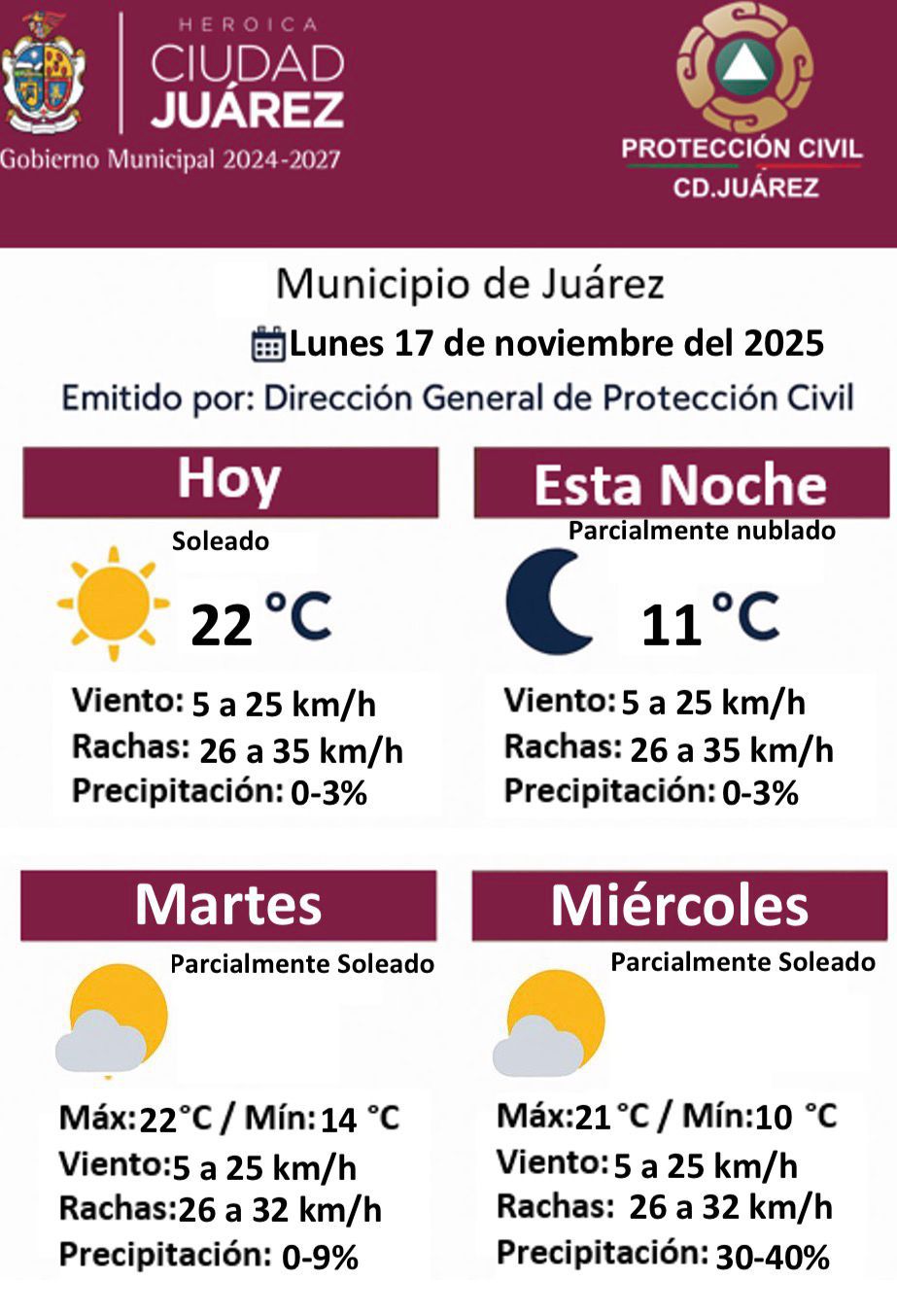 Lunes 17 de Noviembre del 2025.- La Dirección General de Protección Civil del Municipio de Juárez informó el pronóstico del tiempo para este lunes 17 de noviembre de 2025 y los próximos días, destacando condiciones mayormente soleadas y un ligero aumento en la probabilidad de lluvias hacia mitad de semana.