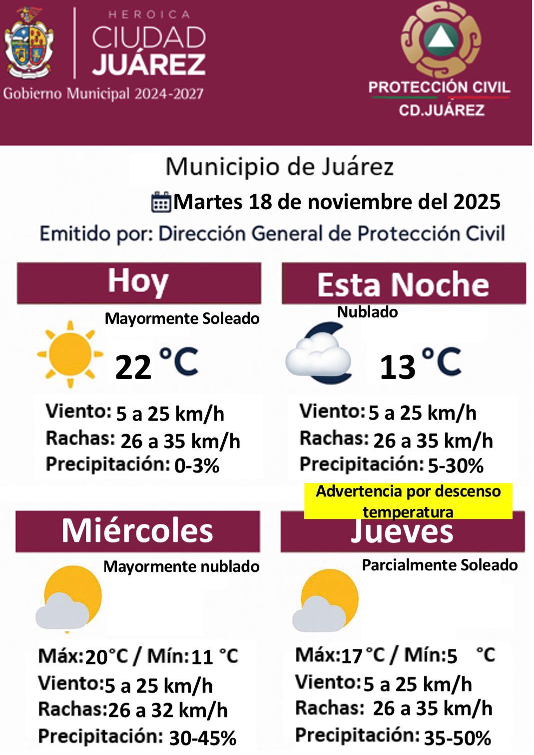Martes 18 de Noviembre del 2025.- La Dirección General de Protección Civil del Municipio informó el pronóstico del clima para este martes 18 de noviembre, en el que se anticipan condiciones mayormente soleadas durante el día, con una temperatura máxima de 22 grados Celsius.