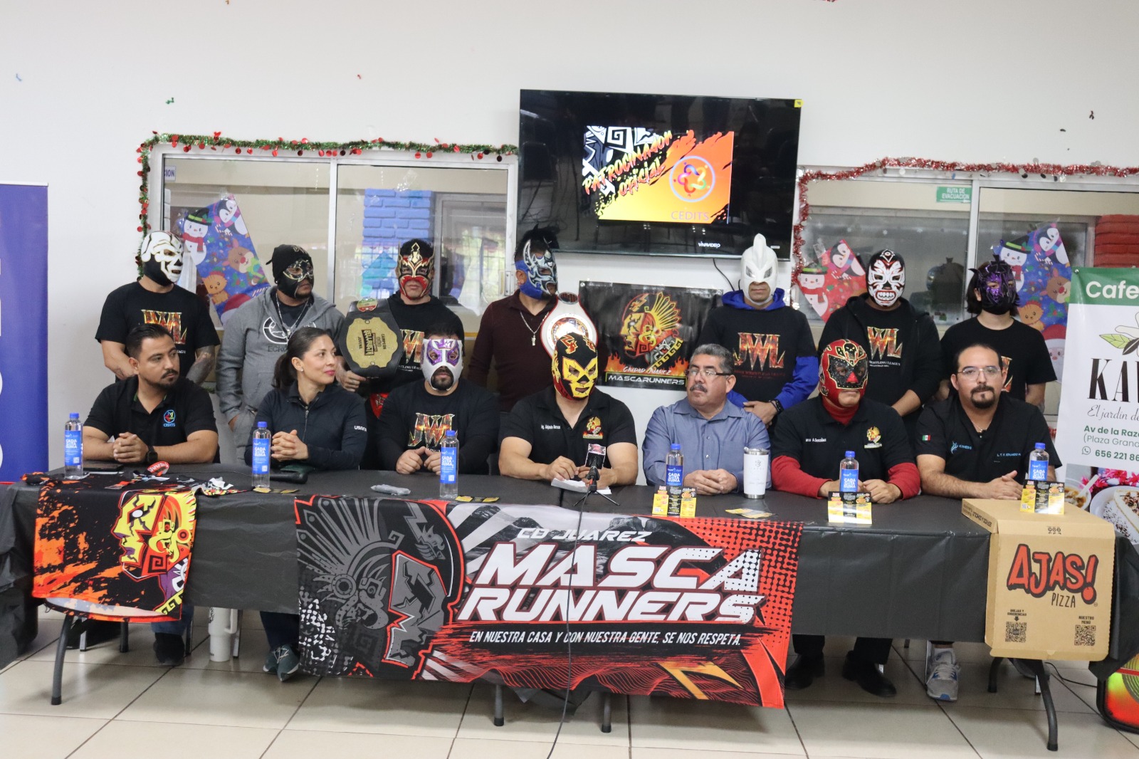 En la conferencia estuvo el capitán del equipo Mascarruners, Alejandro Barraza; Marco González, secretario de Mascarunners; Juan Gallegos, director de Casa del Niño y el Anciano México; el luchador Rey Azteca y el promotor de la arena JWL, Alfredo Torres.