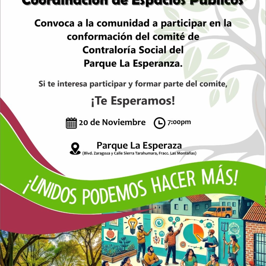 Jueves 20 de Noviembre del 2025.- La Dirección de Centros Comunitarios, a través de la Coordinación de Espacios Públicos, convocó a la comunidad a participar en la conformación del Comité de Contraloría Social del parque La Esperanza. El titular de la dependencia, Luis Fernando Rodríguez Giner, informó que la reunión se realizará hoy en el bulevar Zaragoza y calle Sierra…