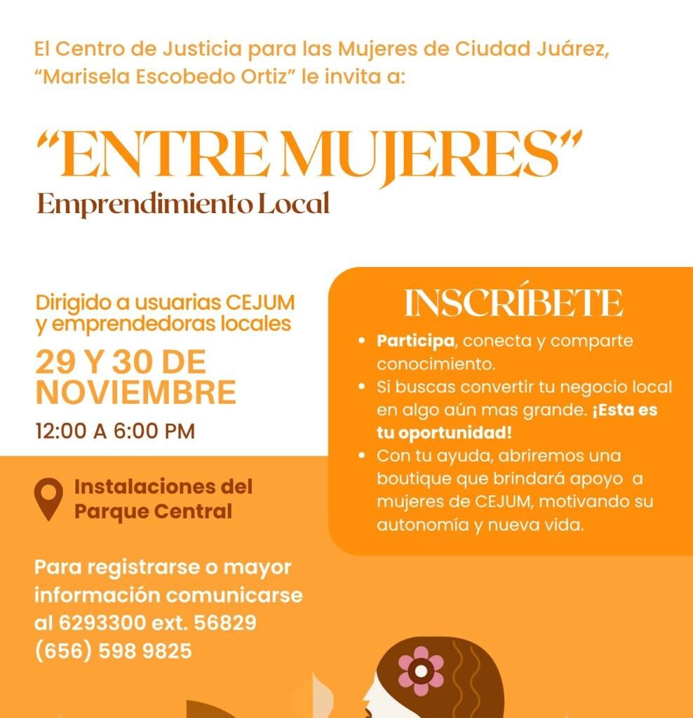Ciudad Juárez, Chih., a 22 de noviembre de 2025.- El Centro de Justicia para las Mujeres “Marisela Escobedo Ortiz”, convoca a todas aquellas emprendedoras, interesadas en participar en la iniciativa con causa Entre mujeres, emprendimiento local. El objetivo es brindar una oportunidad laboral a las emprendedoras de esta ciudad, así como recaudar fondos destinados a la creación de espacios solidarios…
