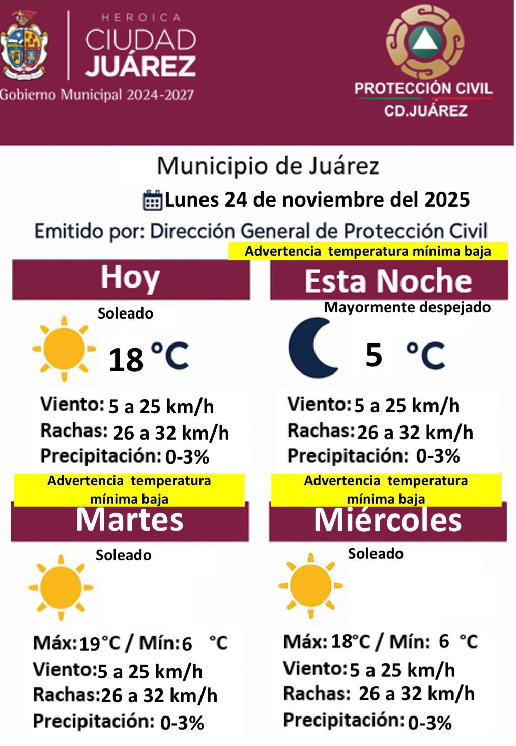 Lunes 24 de Noviembre del 2025.- La Dirección General de Protección Civil del Municipio de Juárez informó las condiciones meteorológicas correspondientes al lunes 24 de noviembre de 2025, así como el pronóstico para los próximos días, destacando una advertencia por temperaturas mínimas bajas que se mantendrá vigente durante el periodo.
