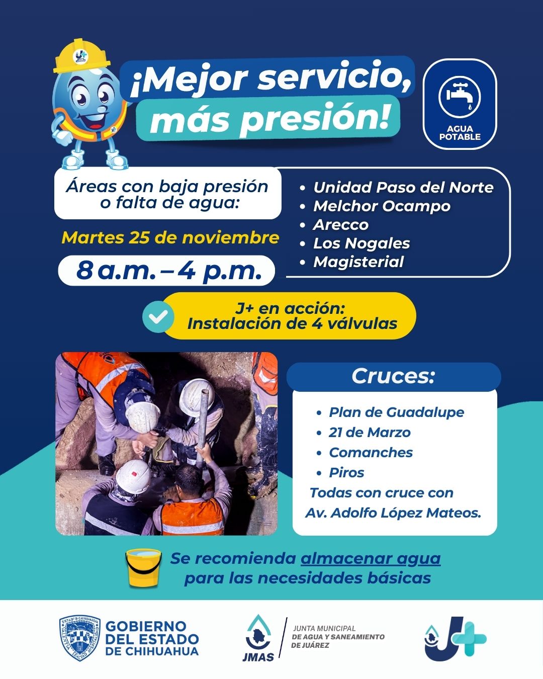 Por estas acciones, habrá suspensión del servicio en los fraccionamientos: Unidad Paso del Norte, Melchor Ocampo, Arecco, Los Nogales, Magisterial y zonas aledañas.