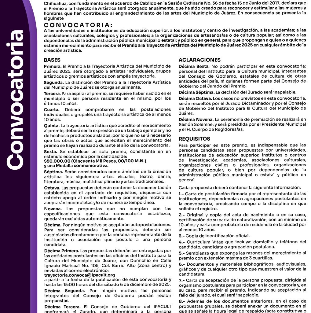 Martes 25 de Noviembre del 2025.- El Gobierno Municipal, a través del Instituto para la Cultura del Municipio de Juárez (IPACULT), ha lanzado la convocatoria para la entrega del Premio a la Trayectoria Artística 2025, un reconocimiento destinado a destacar la labor de las mujeres y hombres que han contribuido al enriquecimiento de las artes y la cultura en Ciudad…