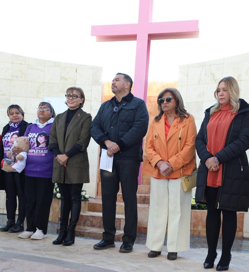 Martes 25 de Noviembre del 2025.- En el marco del Día internacional de la Eliminación de la Violencia Contra las Mujeres, el Presidente Municipal, Cruz Pérez Cuéllar, encabezó la colocación de una ofrenda floral en el Memorial del Campo Algodonero.