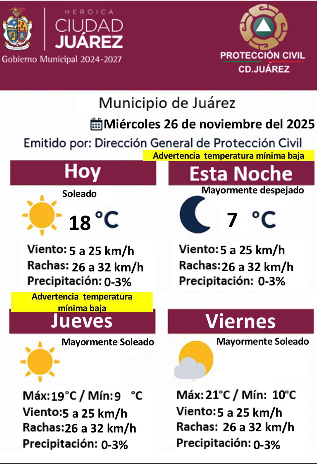Miércoles 26 de Noviembre del 2025.- La Dirección General de Protección Civil del Municipio de Juárez informó que para este miércoles 26 de noviembre de 2025 se mantiene una advertencia por temperaturas mínimas bajas, por lo que se recomienda a la población tomar precauciones durante la tarde, noche y madrugada.