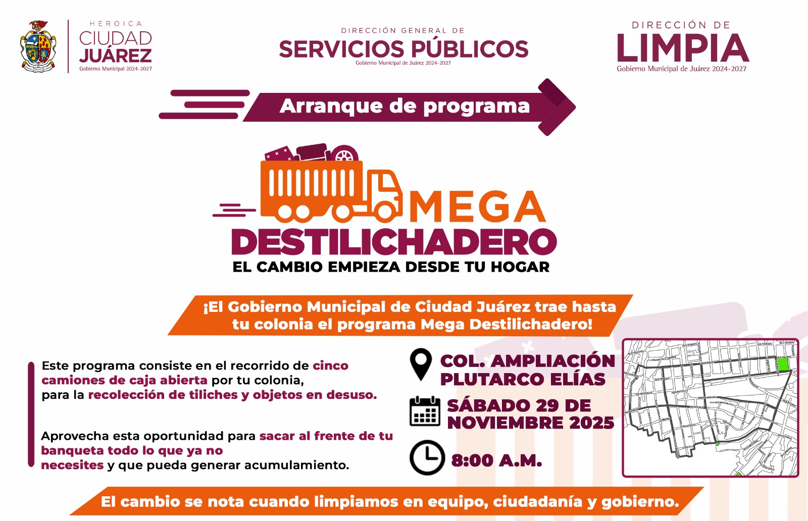 Viernes 28 de Noviembre del 2025.- La Dirección General de Servicios Públicos Municipales, a través de la Dirección de Limpia, llevará mañana sábado el programa Mega Destilichadero hasta la colonia Plutarco Elías Calles, ubicada hacia el poniente de Juárez.