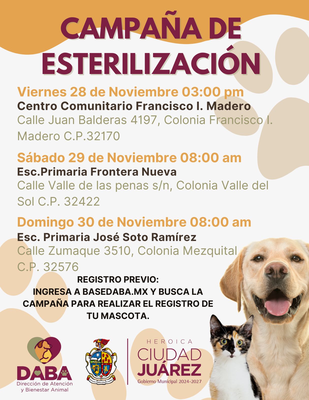 Viernes 28 de Noviembre del 2025.- La Dirección de Atención y Bienestar Animal (DABA), llevará a cabo durante este fin de semana la campaña de Esterilización gratuita en distintos puntos de la ciudad.