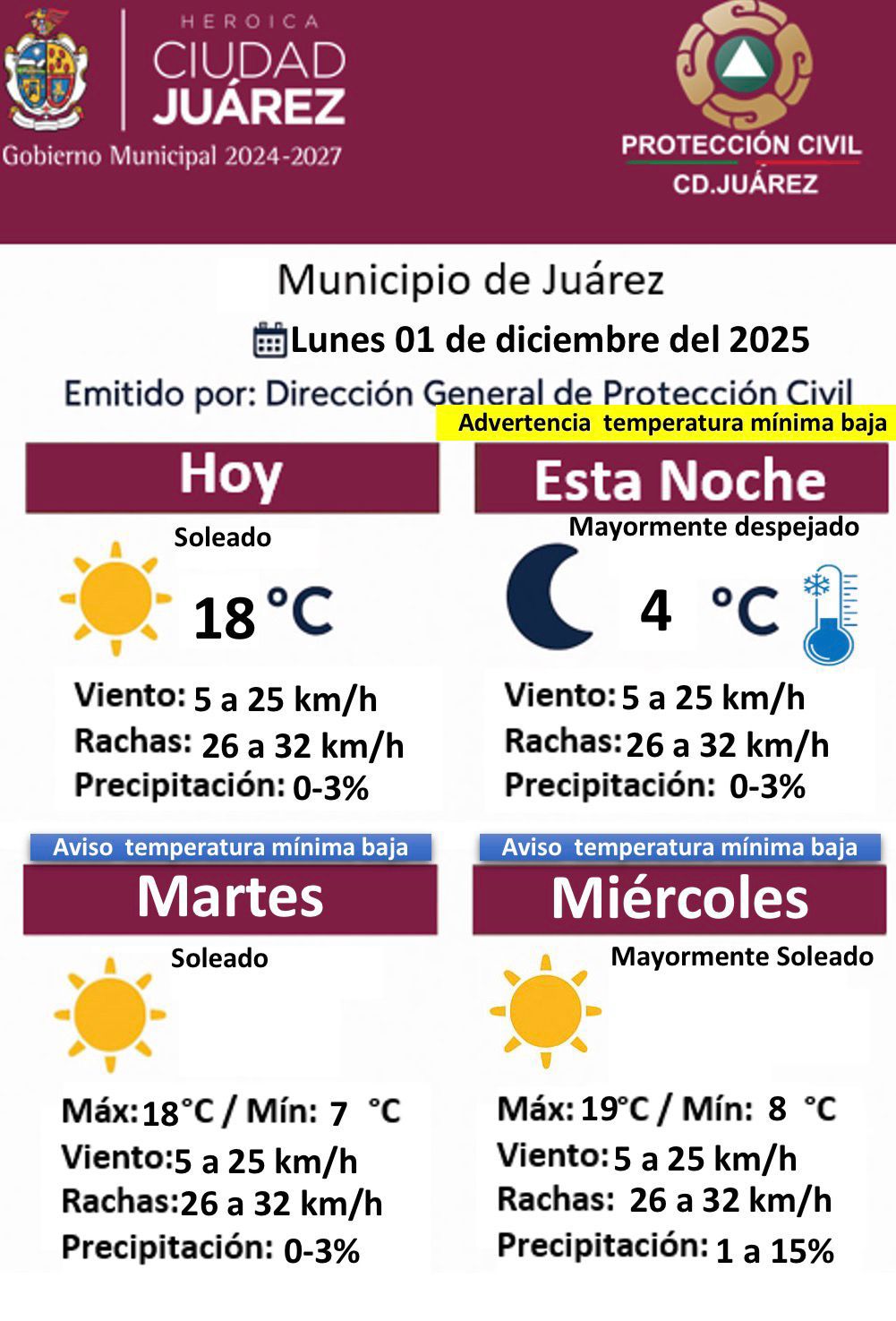 Lunes 1 de Diciembre del 2025.- La Dirección General de Protección Civil del Municipio dio a conocer el pronóstico del clima correspondiente al lunes 1 de diciembre de 2025, acompañado de una advertencia por temperaturas mínimas bajas que se mantendrán durante los próximos días.