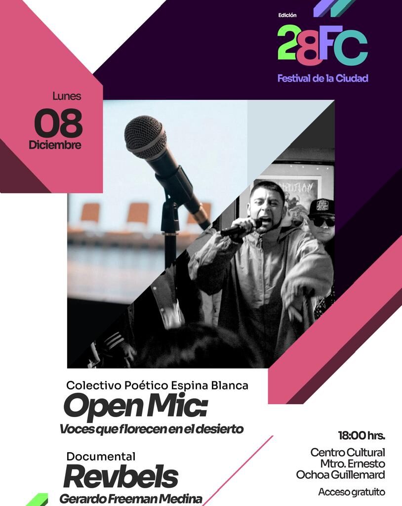 7 de Diciembre del 2025.- El Centro Cultural Ernesto Ochoa Guillemard abrirá mañana sus puertas a una jornada dedicada al arte urbano, la poesía y la memoria colectiva, en el marco de la vigésimo octava edición del Festival de la Ciudad, organizado por el Instituto para la Cultura del Municipio de Juárez (IPACULT). La tarde iniciará con el Open Mic…