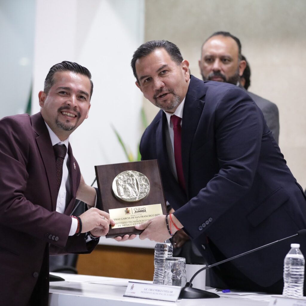 Ciudad Juárez, Chih., 8 diciembre 2025— Con evidente satisfacción y profunda emotividad, el director del Instituto Tecnológico de Ciudad Juárez (ITCJ), Mario Macario Ruiz Grijalva, encabezó la ceremonia en la que el Cabildo otorgó a la institución la Presea Fray García de San Francisco, reconocimiento que distingue su aporte histórico al desarrollo educativo, industrial y tecnológico de la frontera. La…