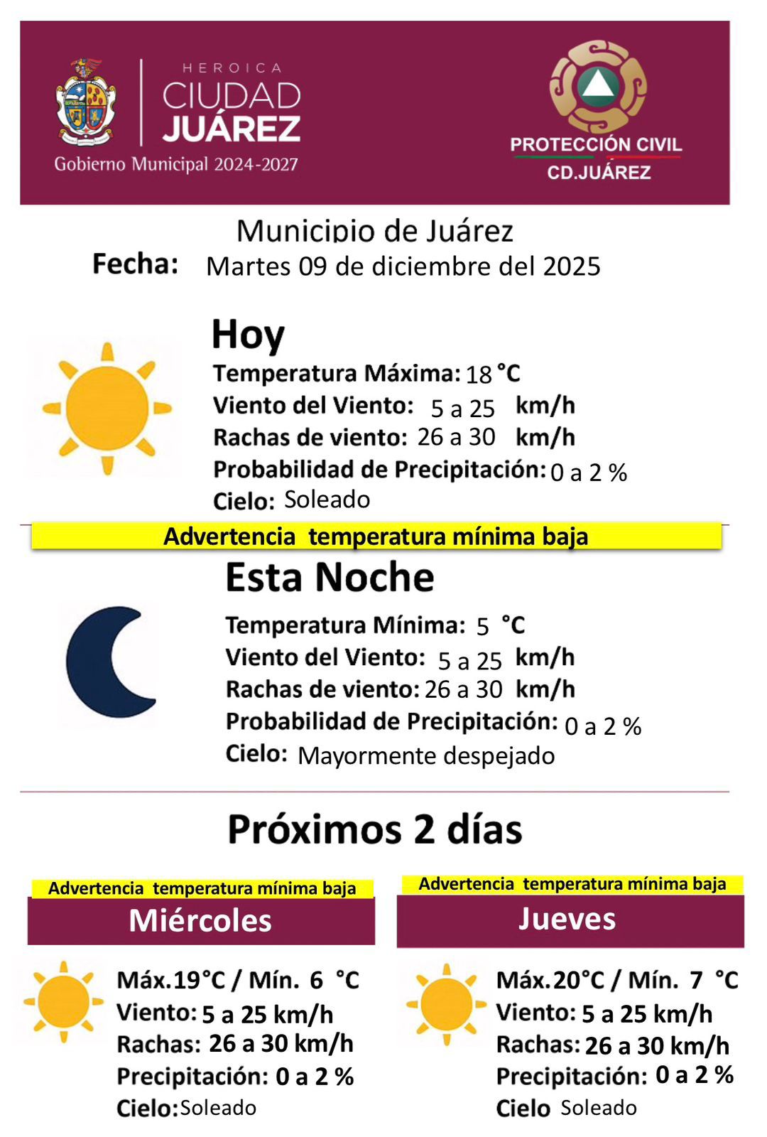 Martes 9 de Diciembre del 2025.- La Dirección General de Protección Civil del Municipio informó que este martes 9 de diciembre de 2025 se mantendrán condiciones de cielo soleado durante el día, aunque con una advertencia por temperatura mínima baja para la noche y la madrugada.