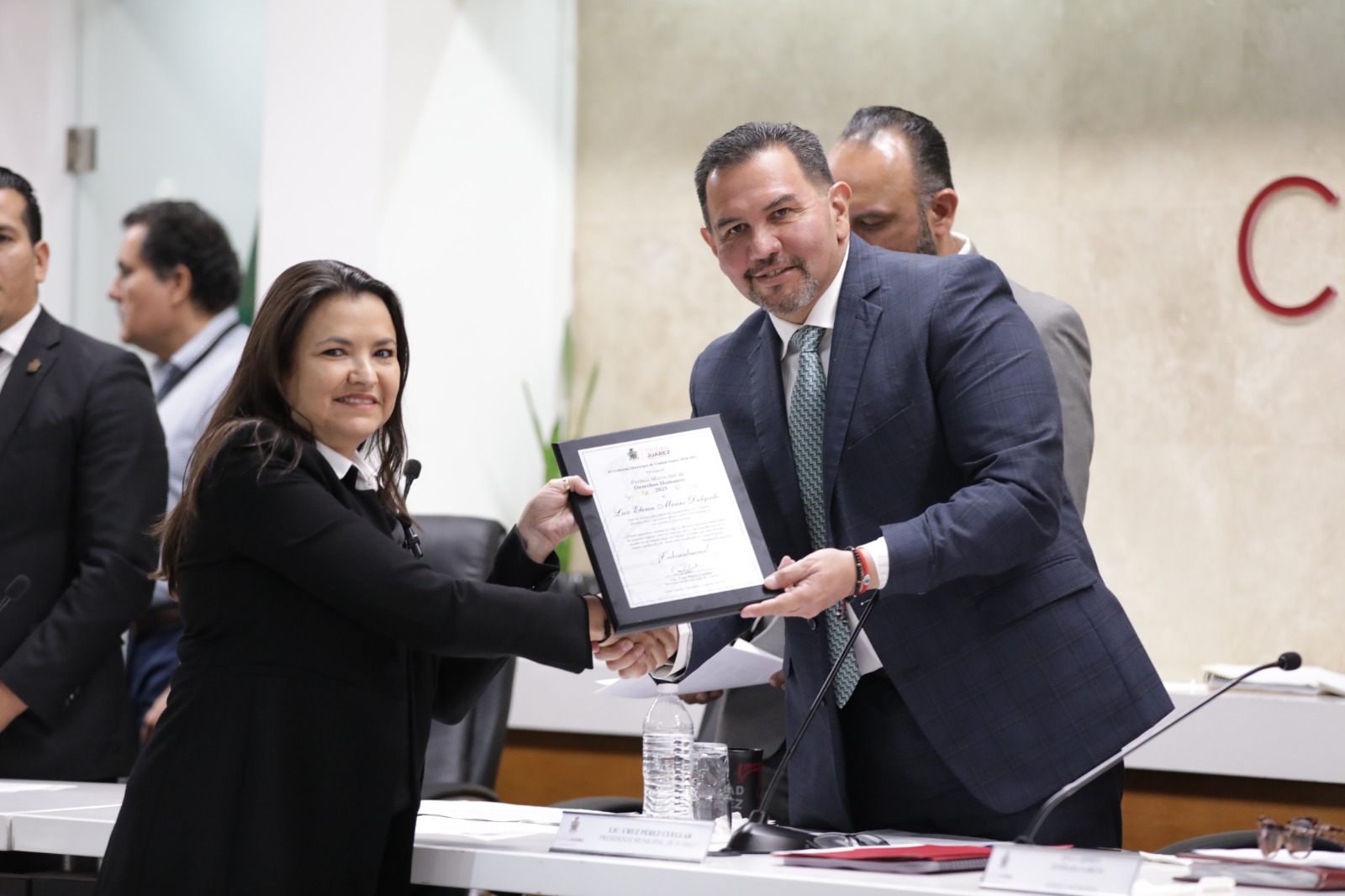 El reconocimiento fue entregado por parte del Presidente Municipal, Cruz Pérez Cuéllar a nombre del Ayuntamiento y de la comunidad juarense.