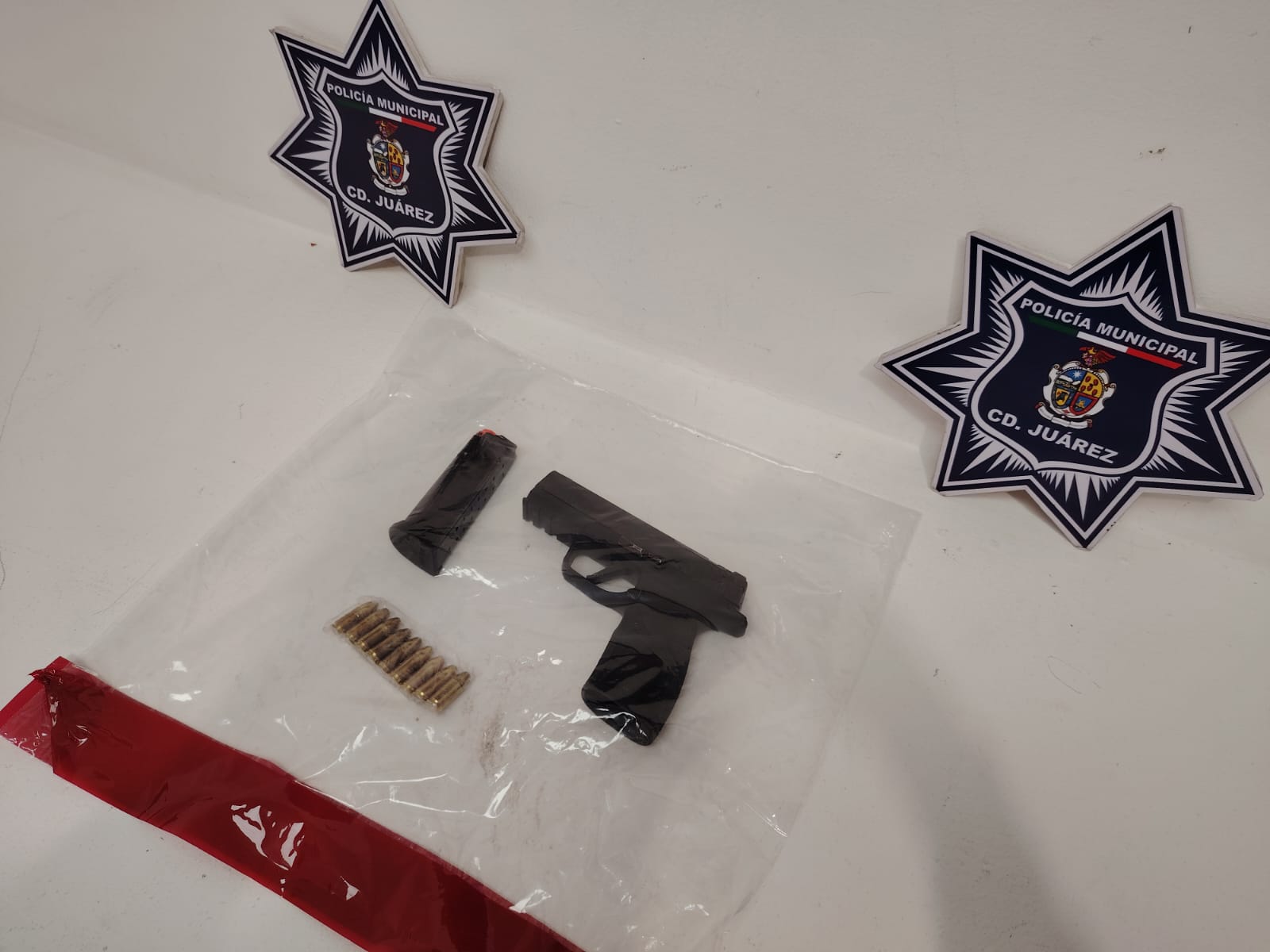 Por tal motivo los oficiales realizaron una inspección en el lugar localizando en el interior del contenedor señalado, un arma de fuego calibre 9 milímetros con un cargador abastecido con nueve cartuchos útiles, procediendo a su resguardo.