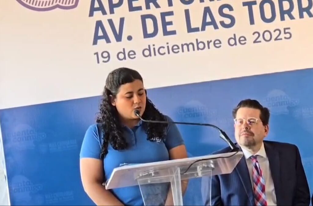 Ciudad Juárez, Chih., 19 de diciembre de 2025— Durante la ceremonia inaugural de la prolongación de la avenida de Las Torres, la estudiante Luna Ayala Robles, de la Universidad Tecnológica de Ciudad Juárez, expuso ante la gobernadora Maru Campos la relevancia social y urbana de esta obra vial, en la que se invirtieron 35 millones de pesos y que beneficiará…