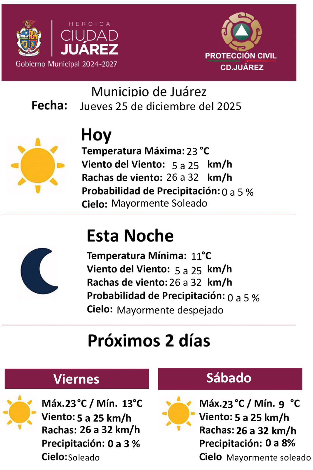 Jueves 25 de Diciembre del 2025.- La Dirección General de Protección Civil informó que este jueves 25 de diciembre se espera un clima mayormente soleado en el municipio de Juárez, con una temperatura máxima de 23 grados centígrados. Durante el día, el viento se presentará con velocidades de entre 5 y 25 kilómetros por hora, con rachas que podrían alcanzar de 26 a 32 kilómetros por hora, mientras que la probabilidad de precipitación se mantiene baja, entre 0 y 5 por ciento.