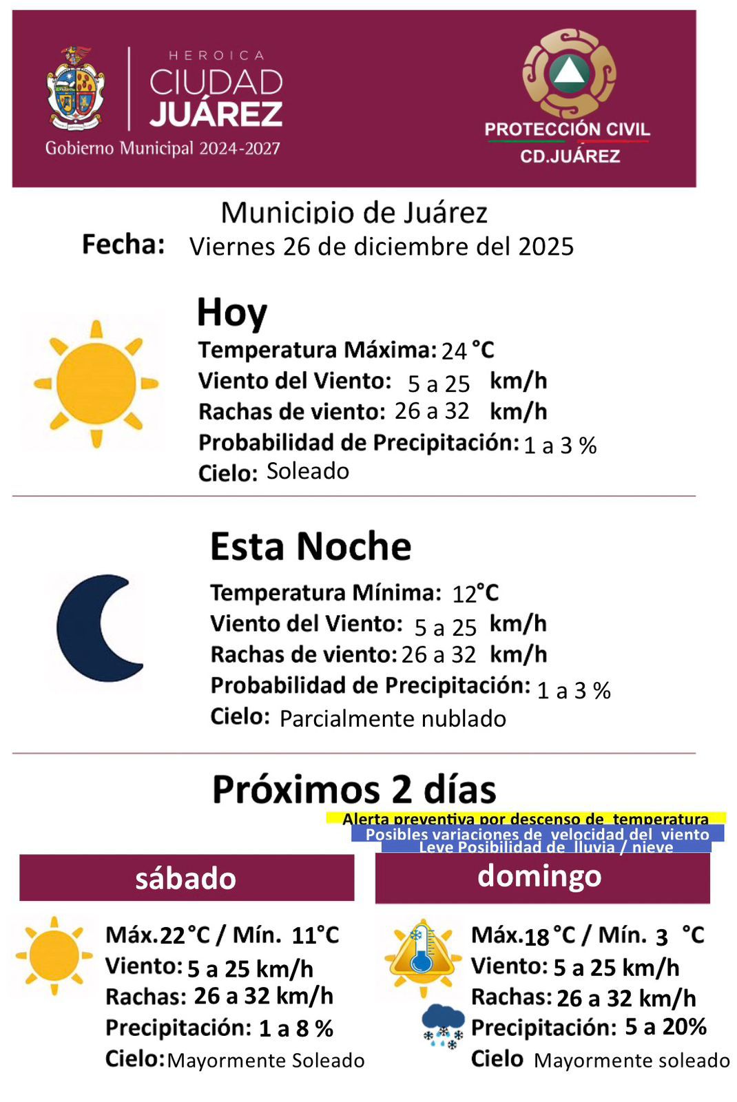 Viernes 26 de Diciembre del 2025.- La Dirección General de Protección Civil del Municipio informó que este viernes 26 de diciembre se espera un clima mayormente favorable en la ciudad.