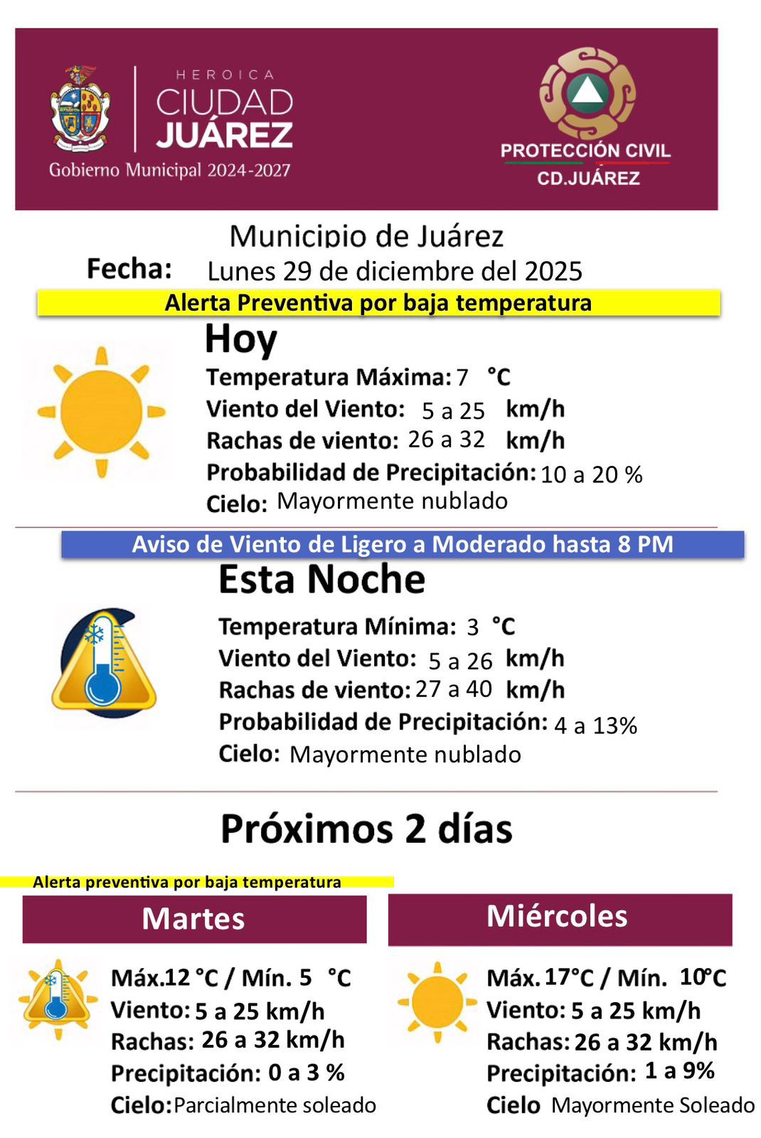 Lunes 29 de Diciembre del 2025.- La Coordinación de Protección Civil del Municipio emitió una alerta preventiva por bajas temperaturas para este lunes 29 de diciembre, ante las condiciones climáticas que se registran en la región.