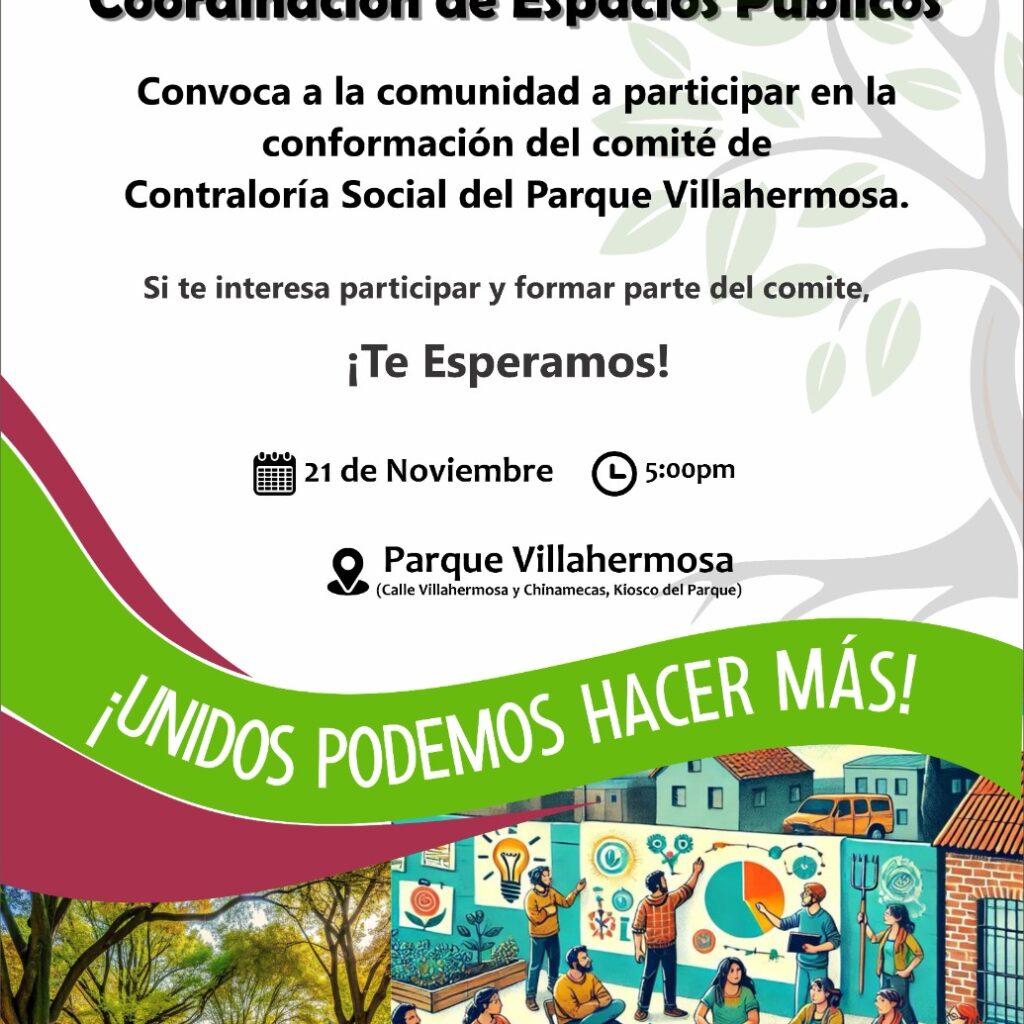 Viernes 21 de Noviembre del 2025.- La Dirección de Centros Comunitarios, a través de la Coordinación de Espacios Públicos, convocó a la comunidad a participar en la conformación del Comité de Contraloría Social del parque Villahermosa. El titular de la dependencia, Luis Fernando Rodríguez Giner, informó que la reunión se realizará hoy en la calle Villahermosa y Chinamecas en el…