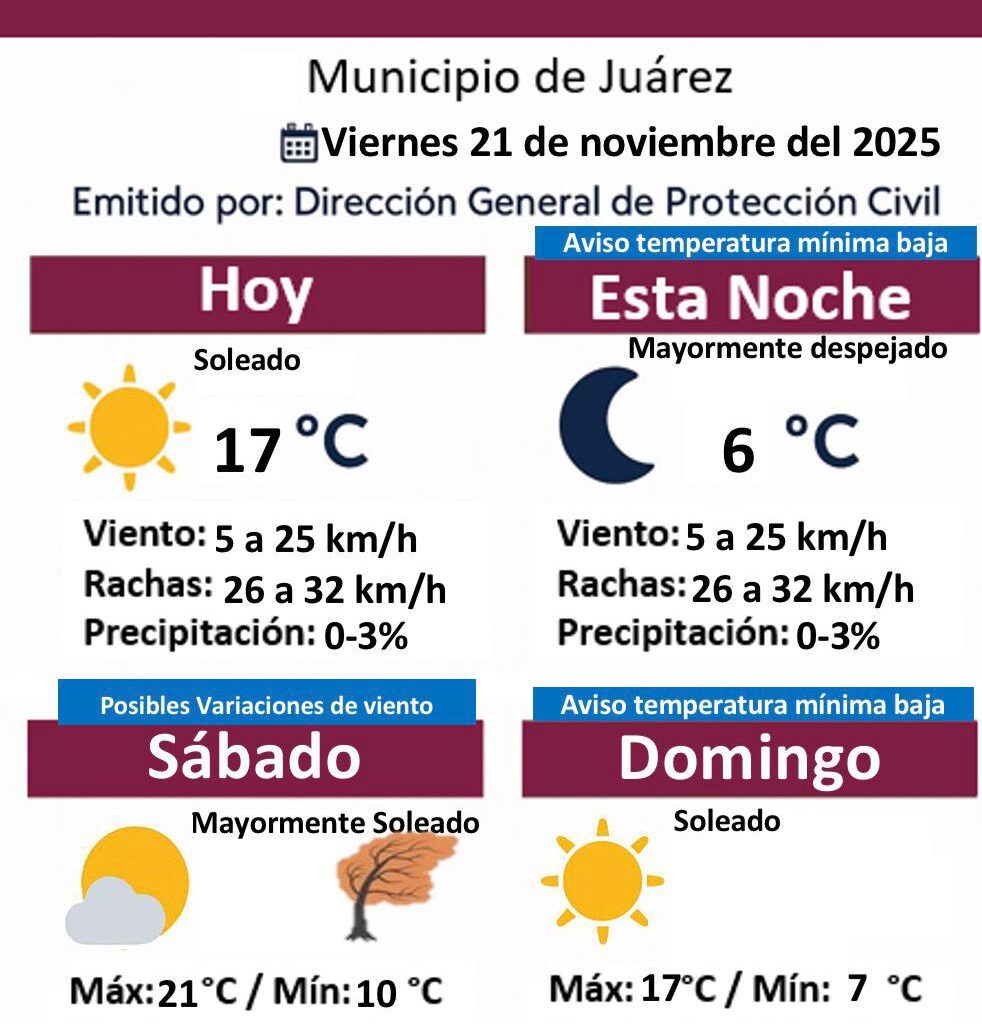 Viernes 21 de Noviembre del 2025.- La Dirección General de Protección Civil del Municipio de Juárez informó que para este viernes 21 de noviembre de 2025 se mantiene un ambiente soleado durante el día, con una temperatura máxima de 17 grados Celsius. El viento oscilará entre 5 y 25 kilómetros por hora, con rachas que podrían alcanzar de 26 a…