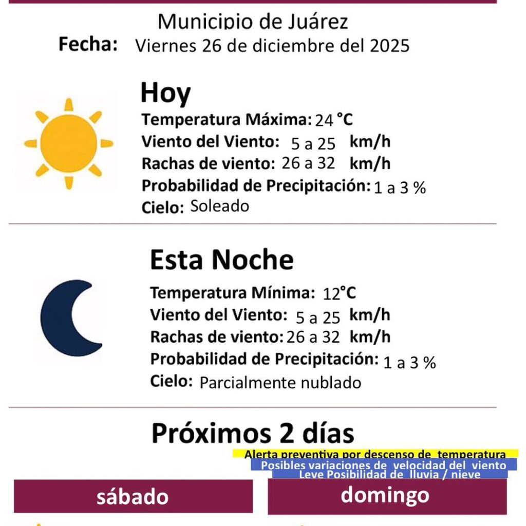 Viernes 26 de Diciembre del 2025.- La Dirección General de Protección Civil del Municipio informó que este viernes 26 de diciembre se espera un clima mayormente favorable en la ciudad. Durante el día, la temperatura máxima alcanzará los 24 grados centígrados, con cielo soleado, vientos de entre 5 y 25 kilómetros por hora y rachas que podrían oscilar entre los…