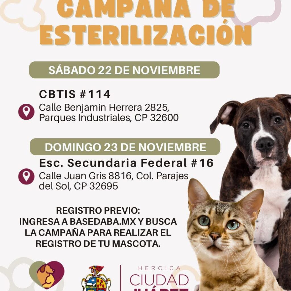 Martes 18 de Noviembre del 2025.- La Dirección de Atención y Bienestar Animal (DABA), llevará a cabo el próximo fin de semana la campaña de Esterilización gratuita en distintos puntos de la ciudad. Las acciones están programadas para el sábado 22 y domingo 23 de noviembre, con el propósito de reducir la sobrepoblación y mejorar la calidad de vida de…