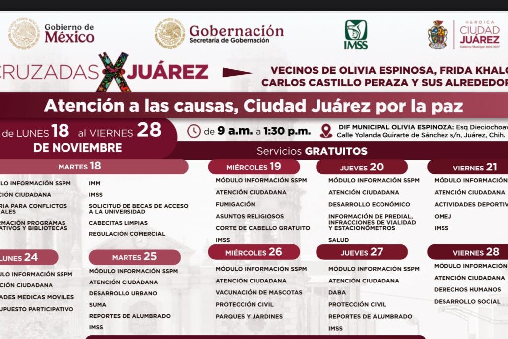 Martes 18 de Noviembre del 2025.- El próximo sábado 29 de noviembre se llevará a cabo el programa “Cruzadas por Juárez, Atención a las Causas, Ciudad Juárez por la Paz” en la colonia Carlos Castillo Peraza, de 8:30 de la mañana a 1:30 de la tarde. La titular de la Coordinación de Atención Ciudadana, María Antonieta Mendoza Mendoza, informó que…
