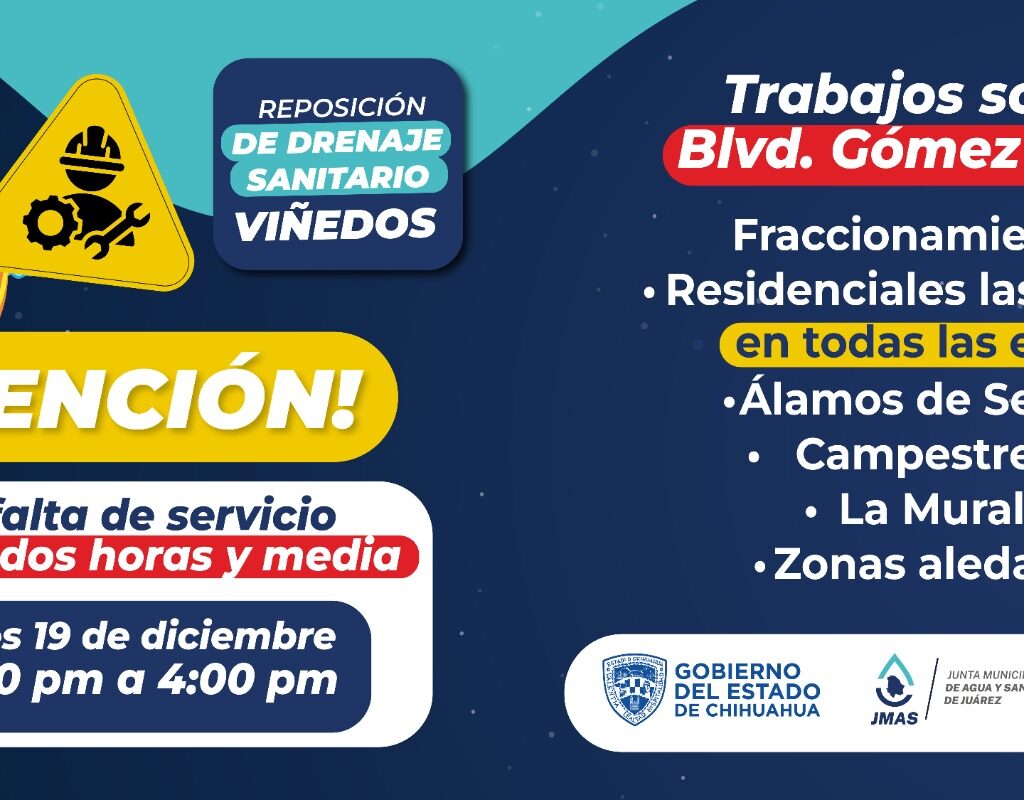 Read MorePOR TERMINAR OBRA DEL COLECTOR VIÑEDOS, SUSPENSIÓN DE SERVICIO SOLO POR DOS HORAS Y MEDIA EN ZONAS ALEDAÑAS EN BLVD. GÓMEZ MORÍN