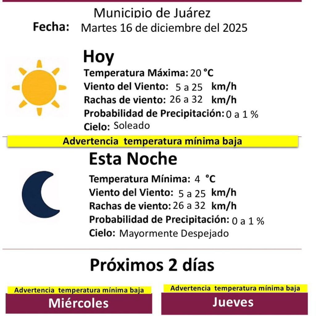 Martes 16 de Diciembre del 2025.- La Dirección General de Protección Civil del Municipio dio a conocer el pronóstico del clima para este martes 16 de diciembre, en el que se mantiene una advertencia por temperatura mínima baja. Para hoy se prevé una temperatura máxima de 20 grados centígrados, con cielo soleado durante la mayor parte del día. El viento…