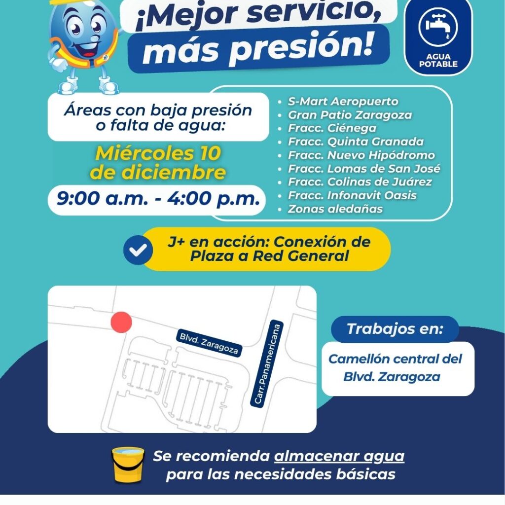 Este miércoles 10 de diciembre, la Junta de Agua y Saneamiento de Juárez conectará una Plaza Comercial a la red general. Los trabajos se realizarán de las 9 de la mañana a las 4 de la tarde, sobre el camellón central del Boulevard Zaragoza, por lo que se recomienda circular con precaución, ante las maniobras de la maquinaria pesada. Por…