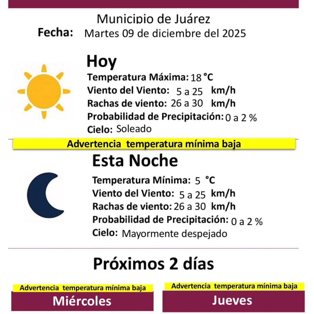 Martes 9 de Diciembre del 2025.- La Dirección General de Protección Civil del Municipio informó que este martes 9 de diciembre de 2025 se mantendrán condiciones de cielo soleado durante el día, aunque con una advertencia por temperatura mínima baja para la noche y la madrugada. Para hoy, la temperatura máxima alcanzará los 18 grados centígrados, con vientos que oscilarán…