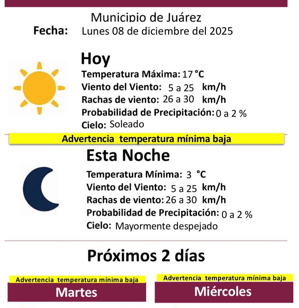 Lunes 8 de Diciembre del 2025.- El Municipio de Juárez, a través de la Dirección General de Protección Civil, informó el pronóstico del clima correspondiente al lunes 08 de diciembre de 2025, advirtiendo nuevamente sobre condiciones de temperatura mínima baja durante la noche y madrugada. Para este día se espera una temperatura máxima de 17 °C, con cielo despejado y…